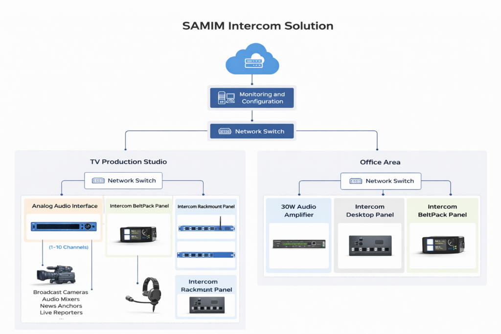 The SAMIM Broadcast Studio Communication System is an advanced IP-based solution designed to deliver seamless and real-time audio communication within radio and television production environments. It is also suitable for internal voice communication across various facilities such as hotels, hospitals, government institutions, and other public or corporate buildings.